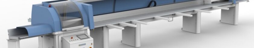 Machine voor het zagen onder verstekken met automatische opduwsysteem en optimalisatie-software. De machine is te bedienen via een touch-screen aan de voorzijde van de machine.