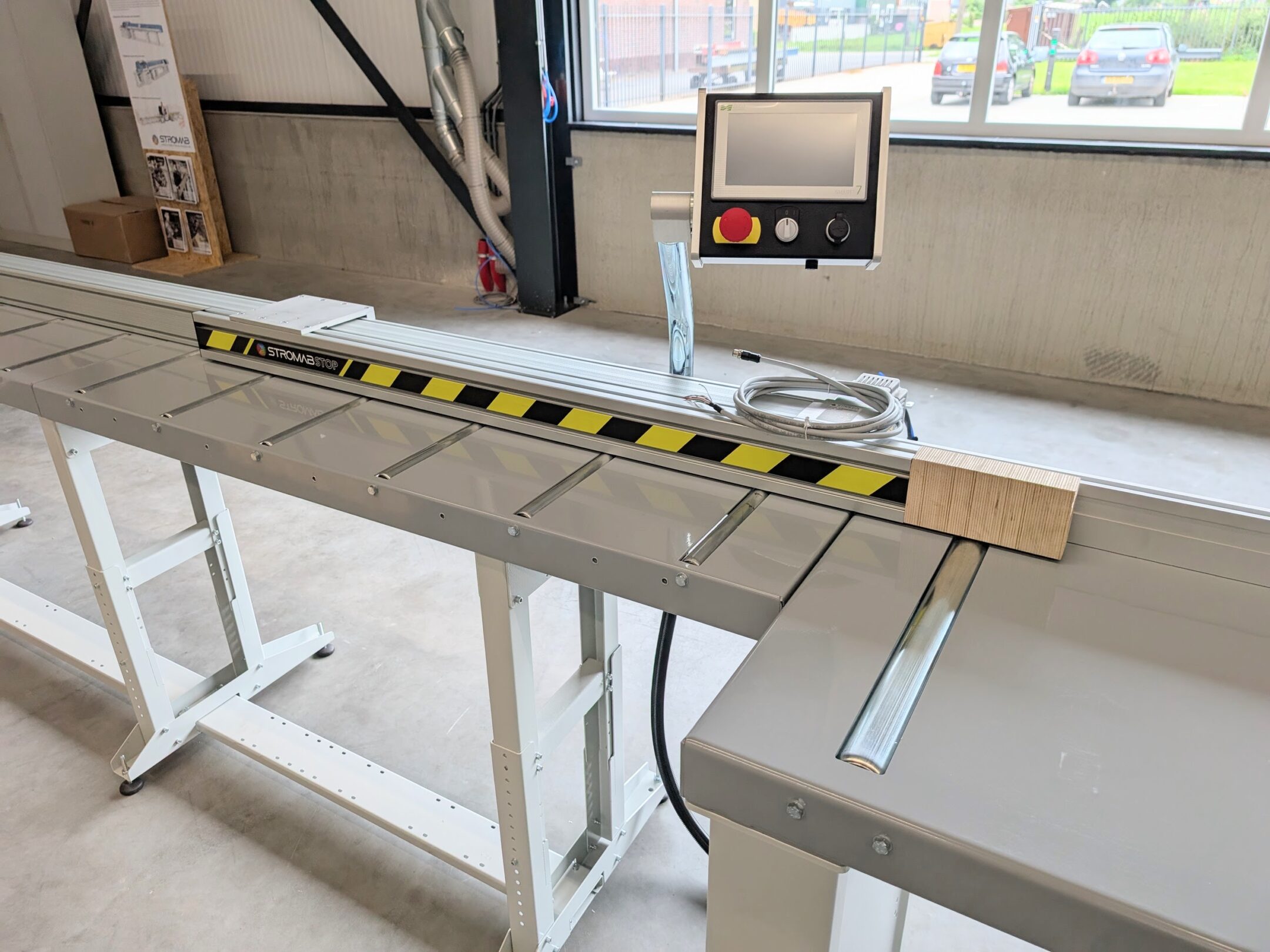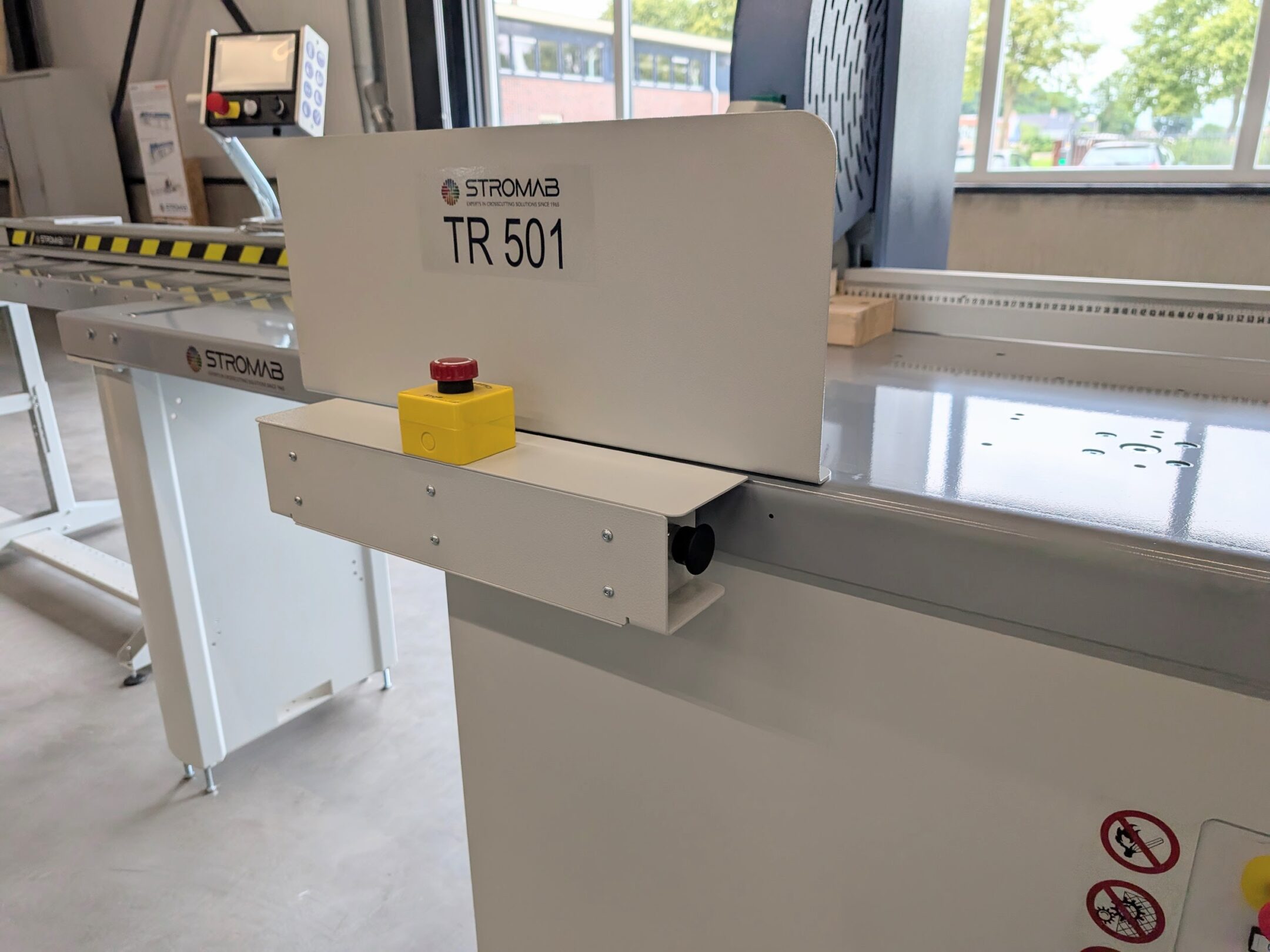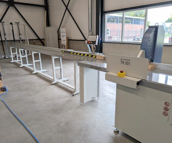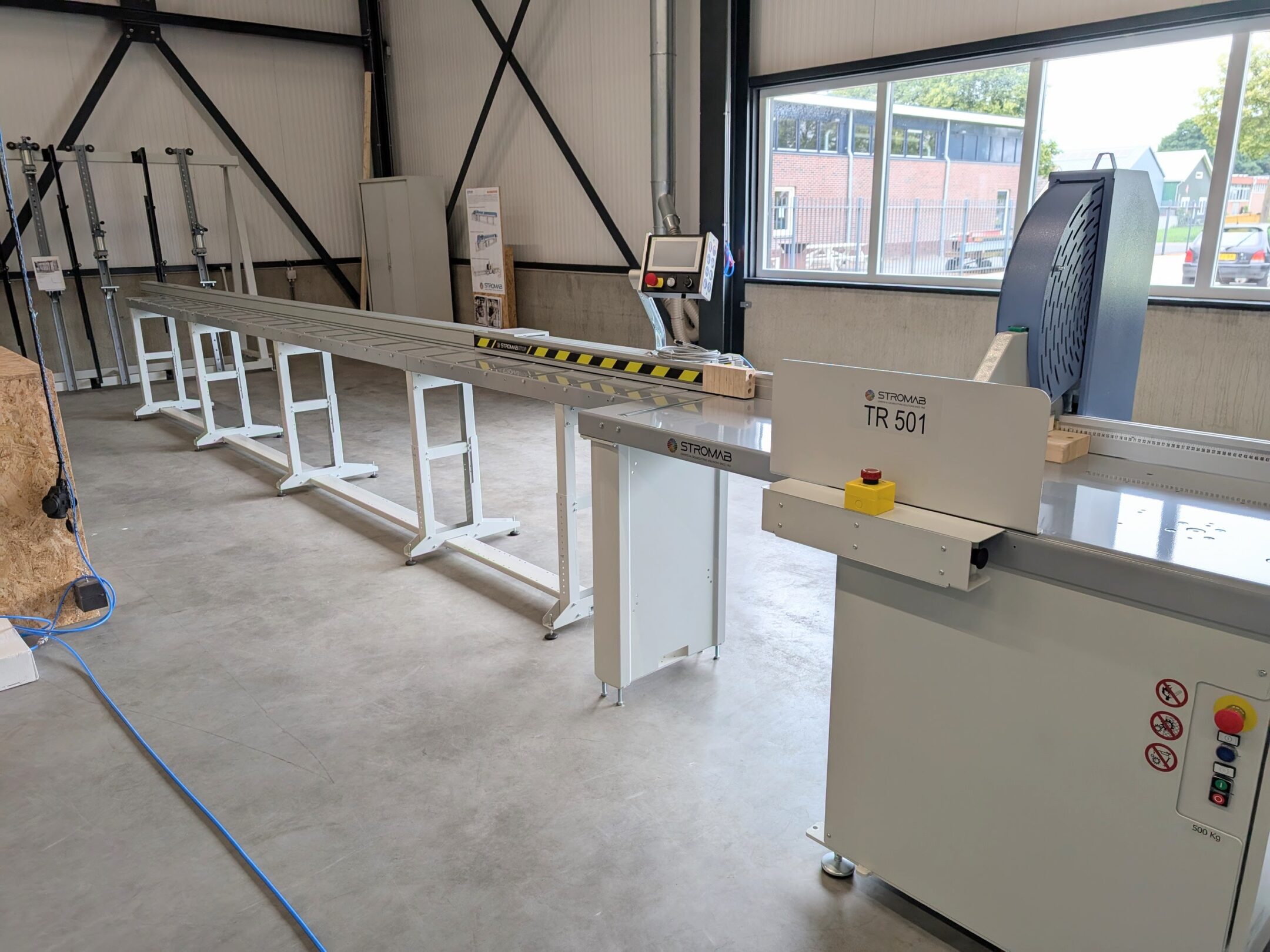 De Stromab TR501 is een hoogwaardige onderafkortzaagmachine. Deze showroom opstelling is uitgerust met een Stromabstop 6000 automatisch lengtemeetsysteem, dit zorgt voor uiterst nauwkeurig, veilig en snel haaks afkorten.