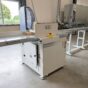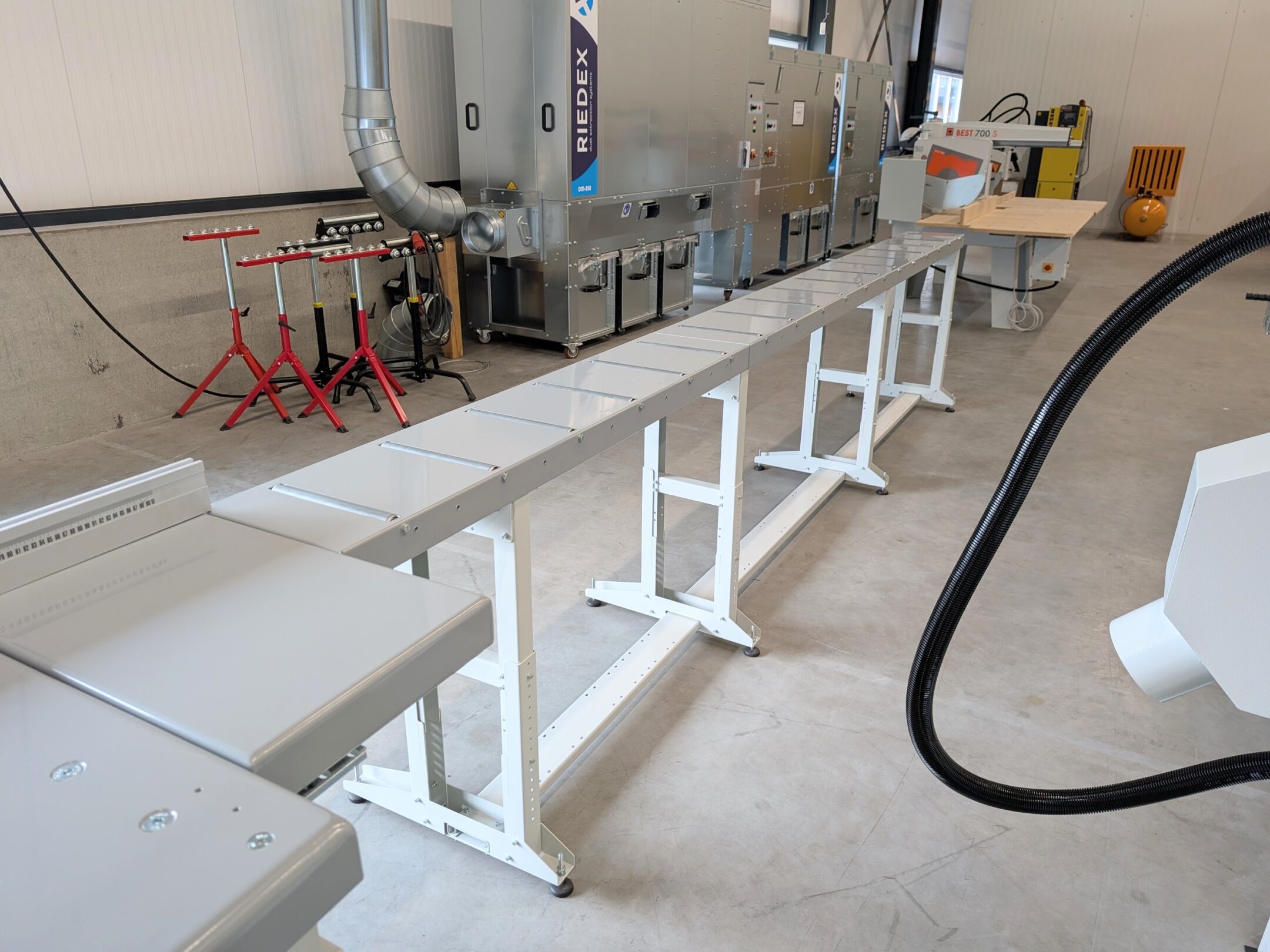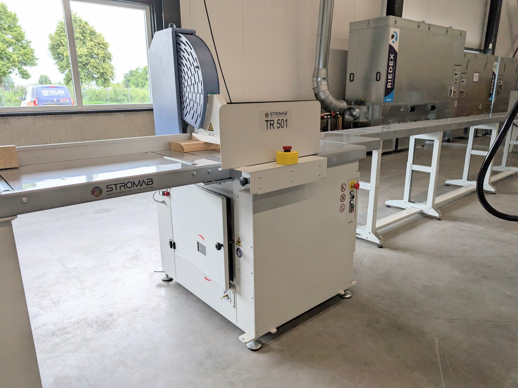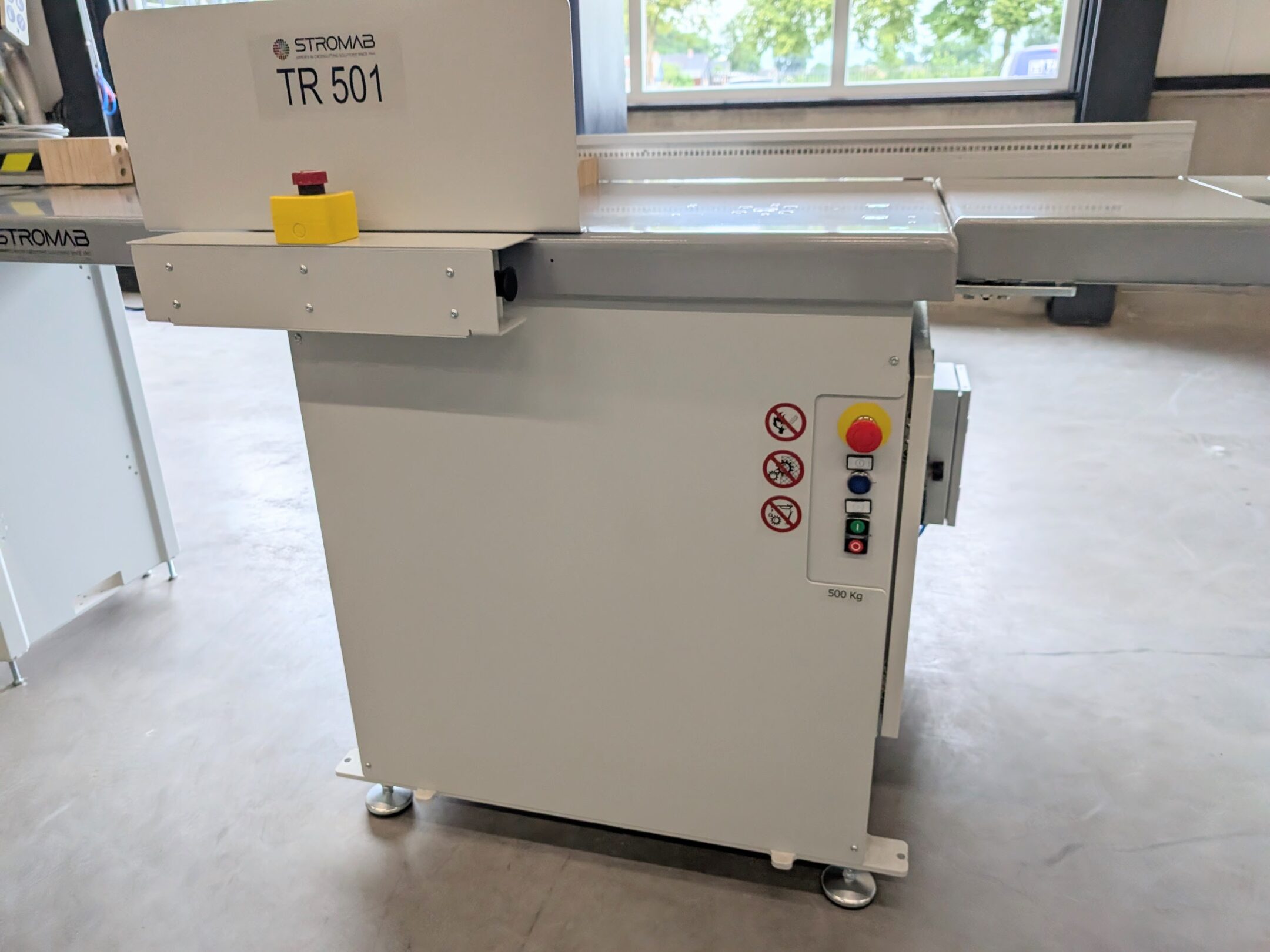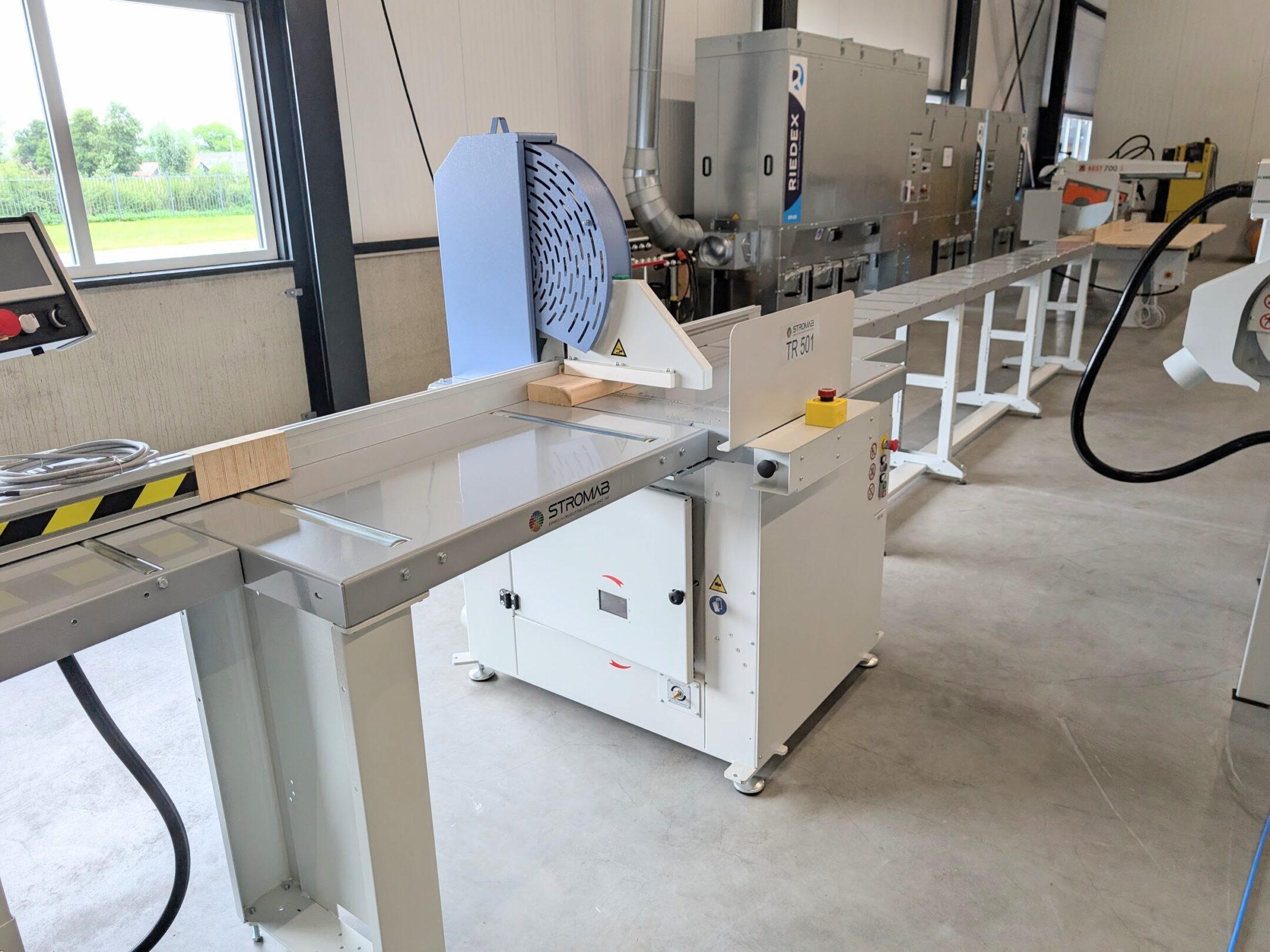 De Stromab TR501 is een hoogwaardige onderafkortzaagmachine. Deze showroom opstelling is uitgerust met een Stromabstop 6000 automatisch lengtemeetsysteem, dit zorgt voor uiterst nauwkeurig, veilig en snel haaks afkorten.