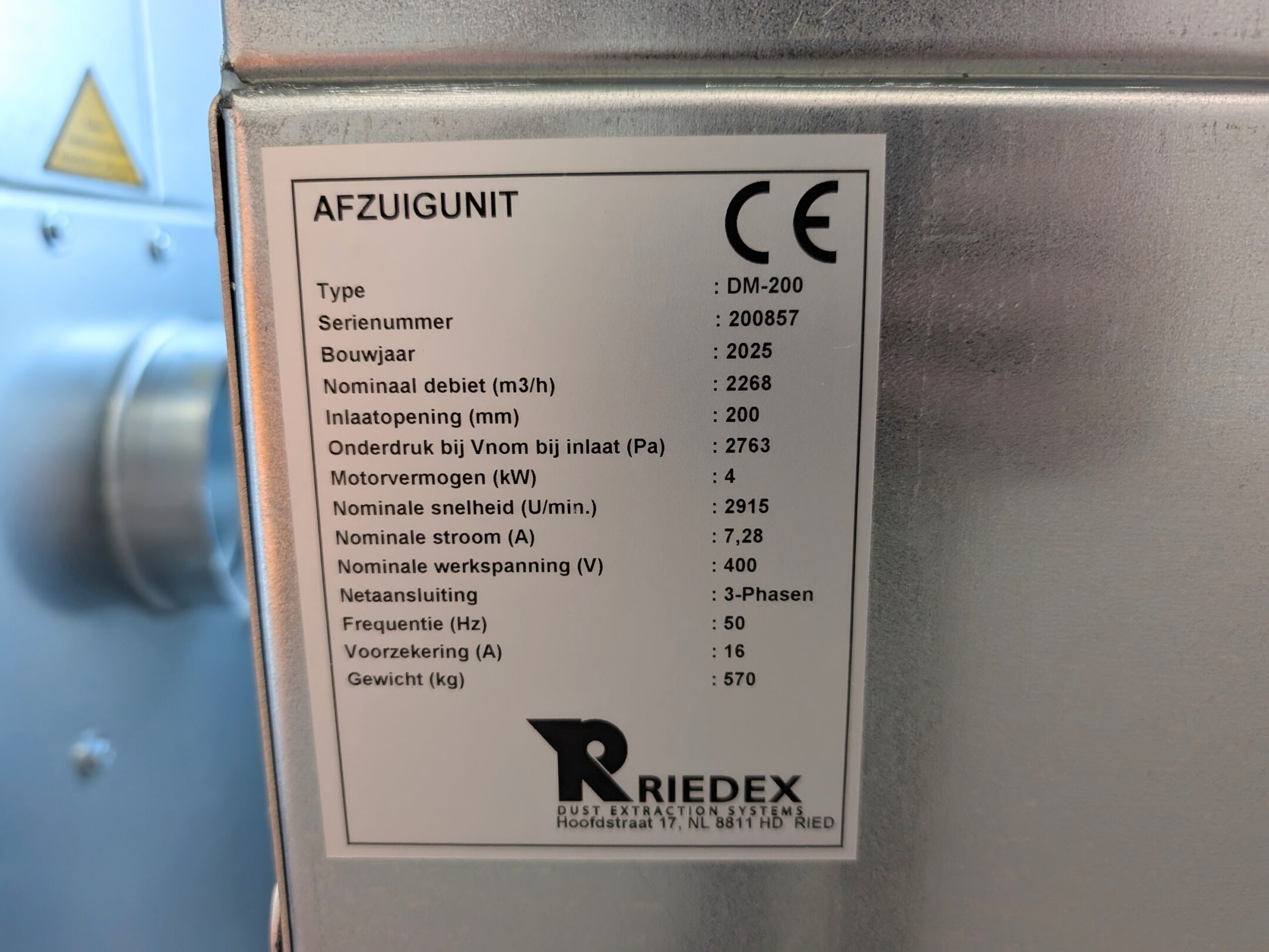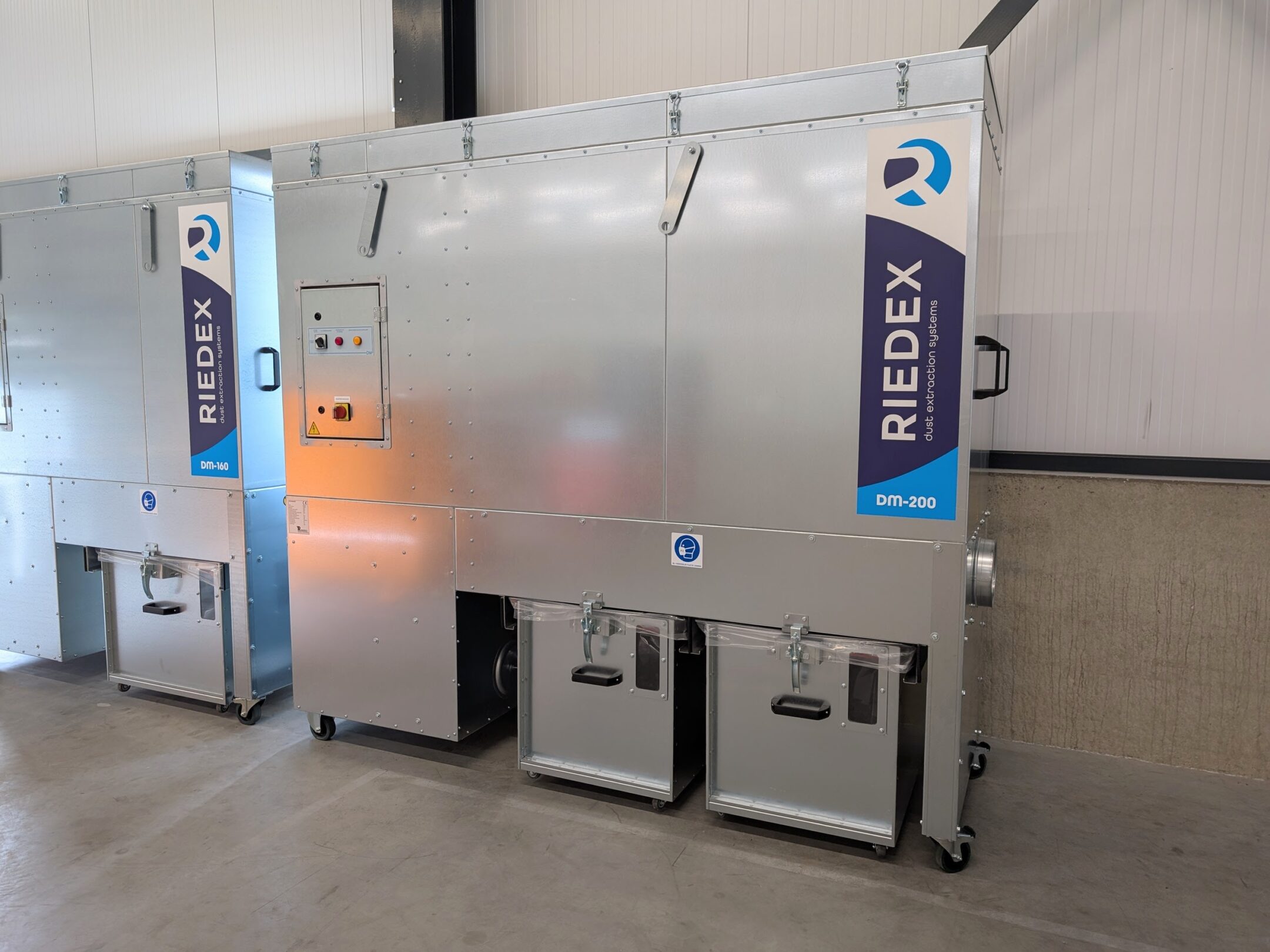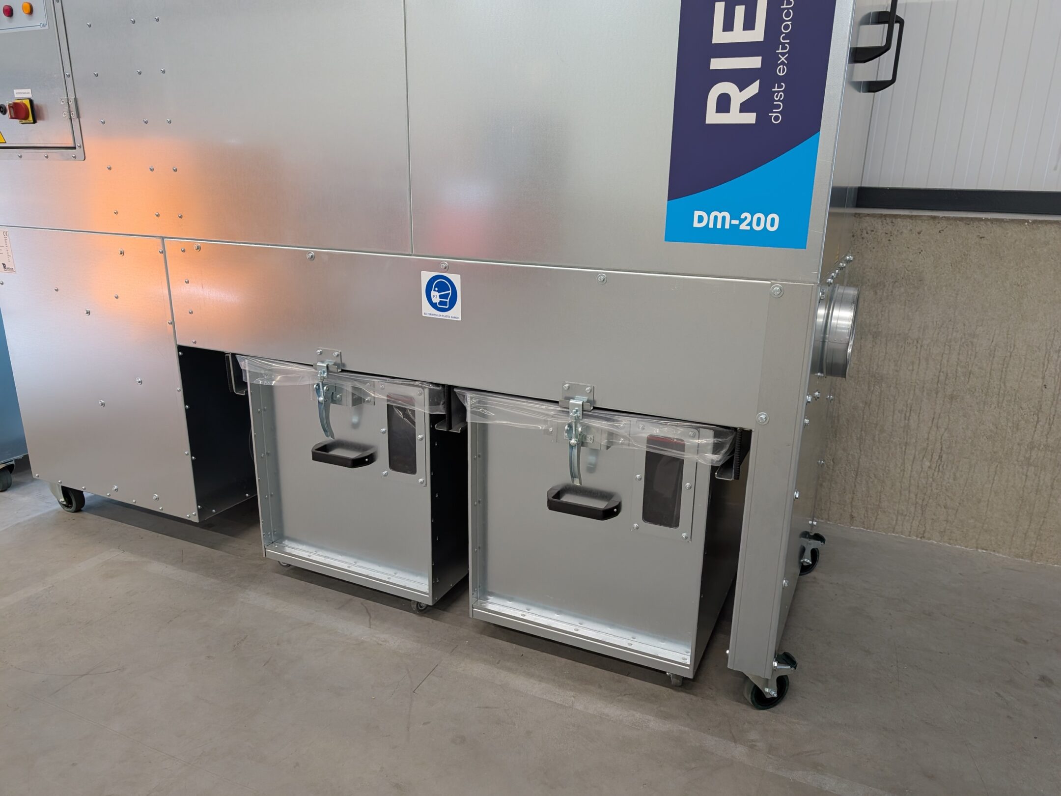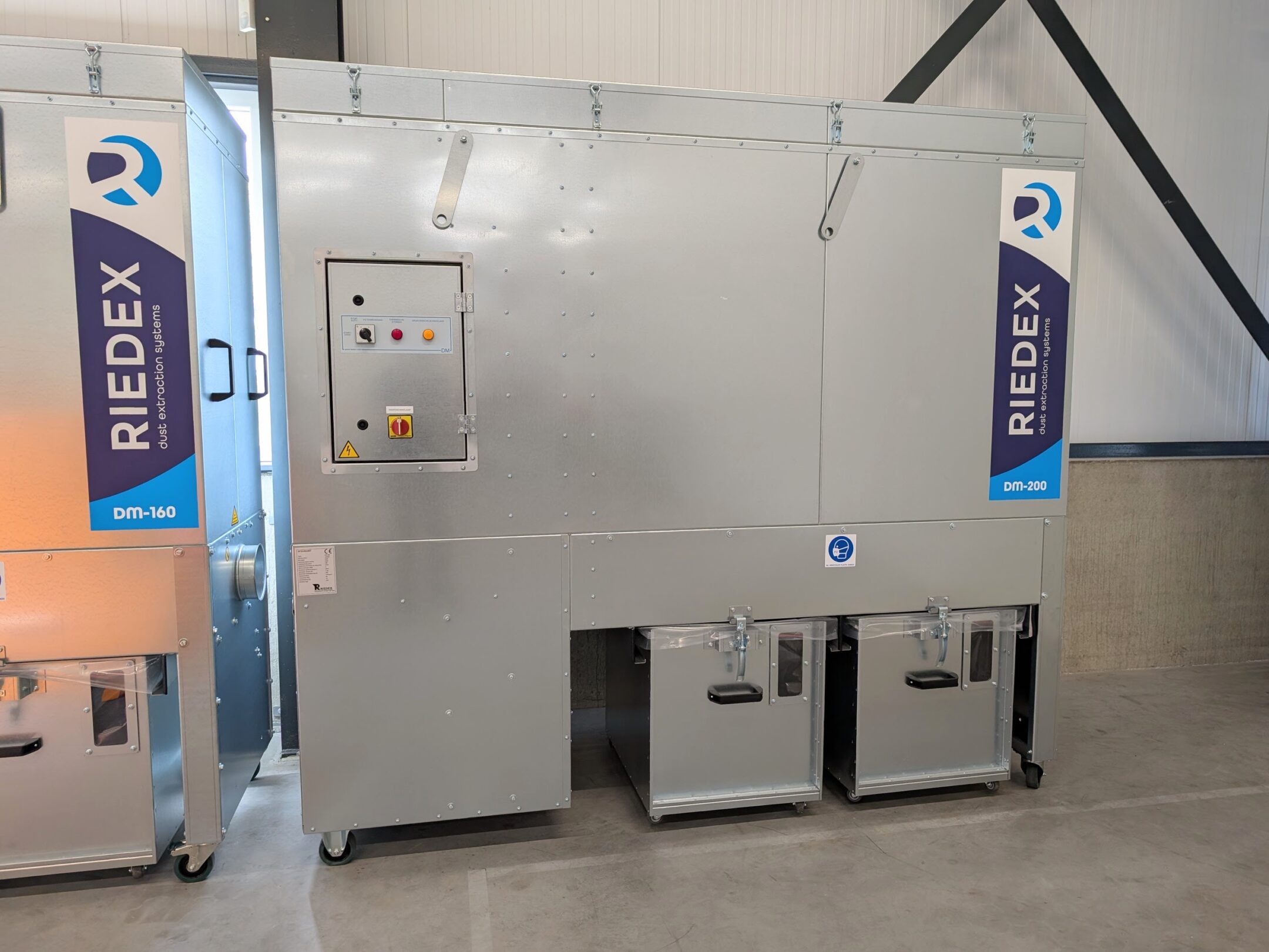 Verrijdbare afzuigunit met een capaciteit van 3200 m3/h, unit heeft een uitstoot van minder dan 0,5mg/m3 reststof. De aanzuigzijde is rechts.