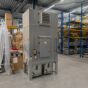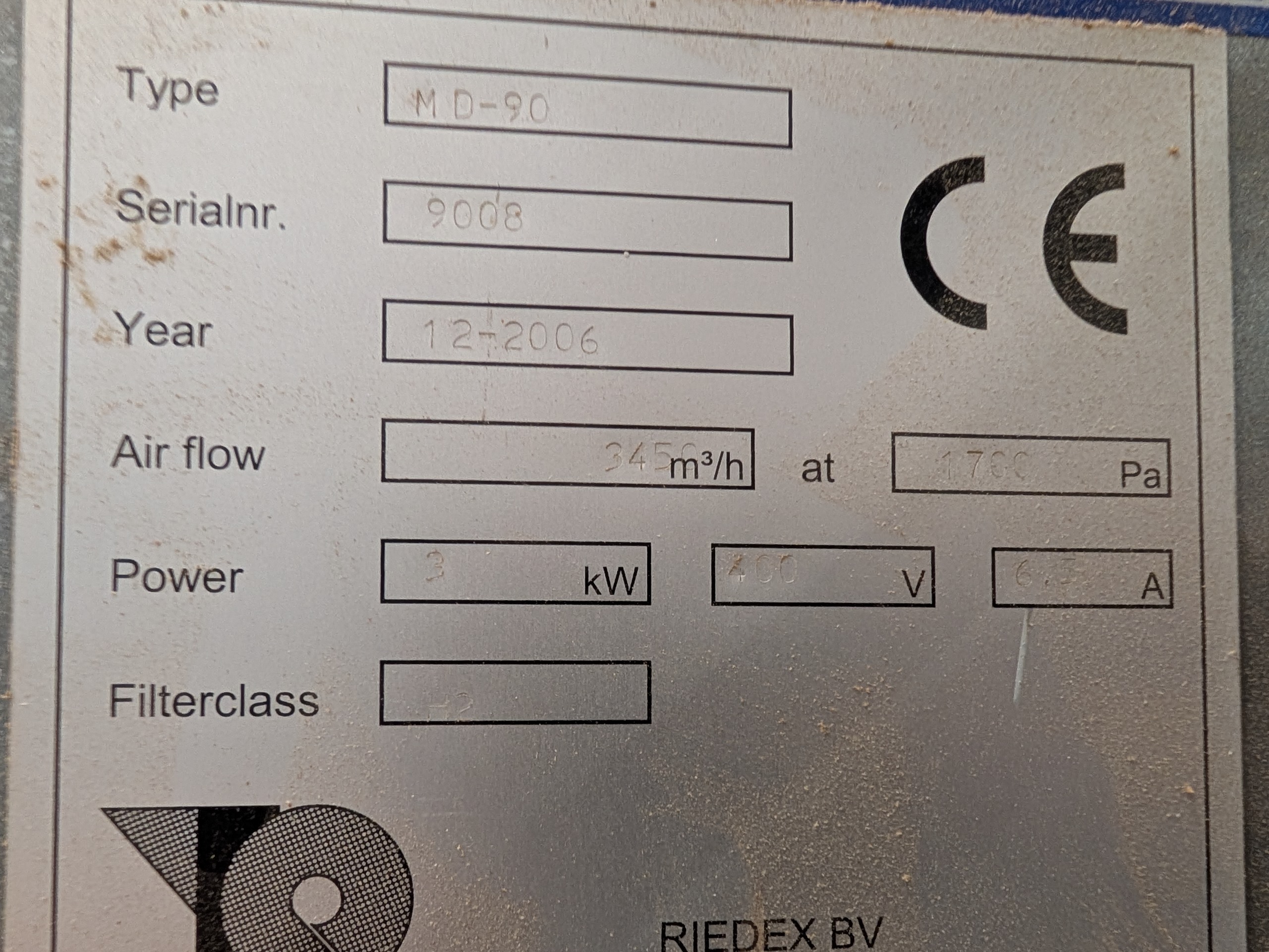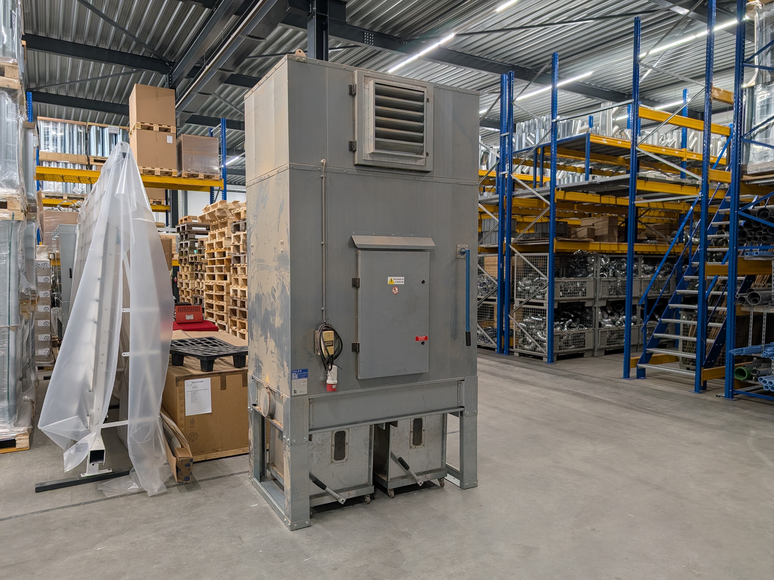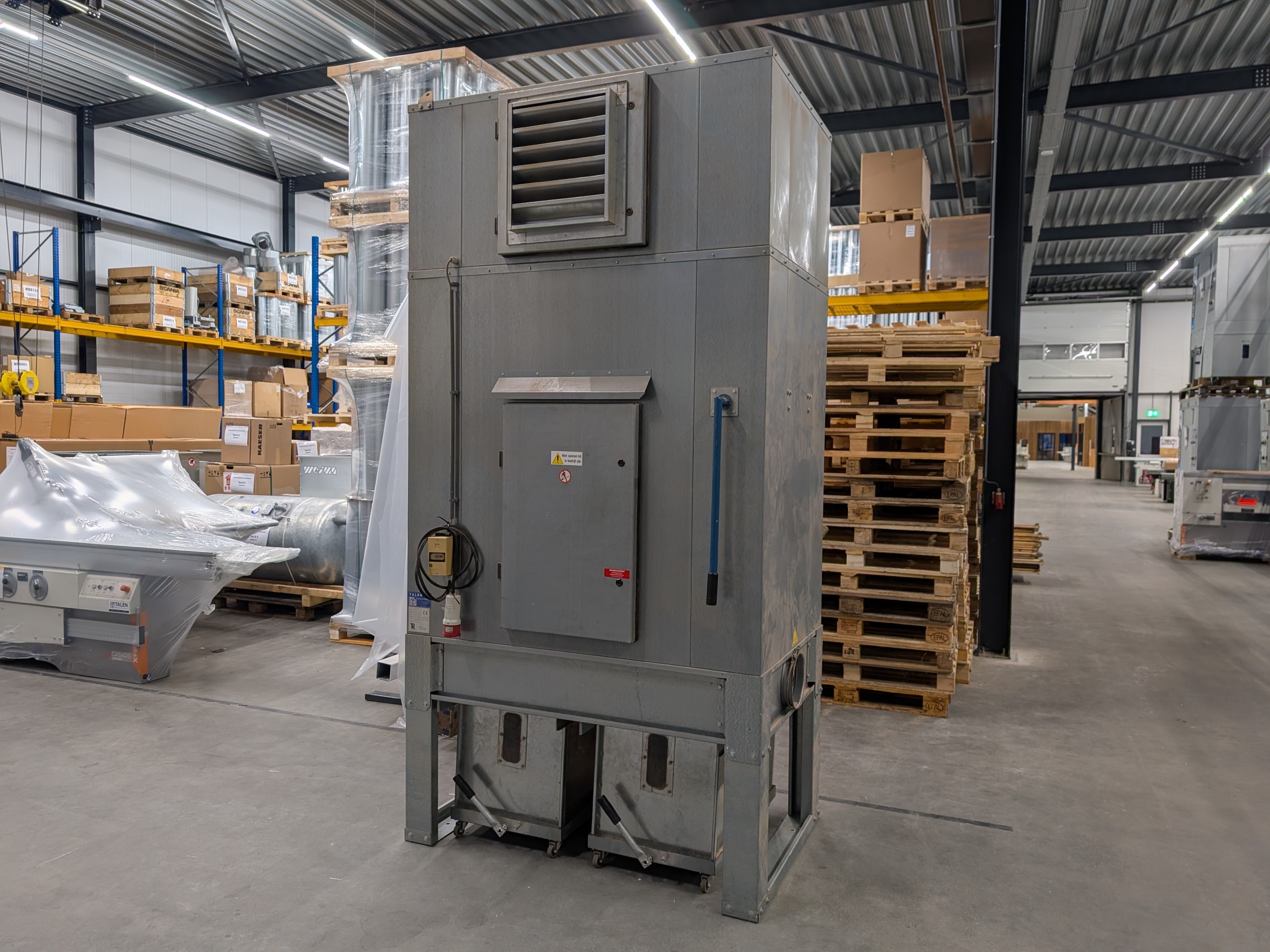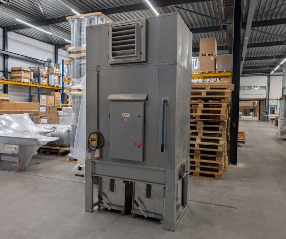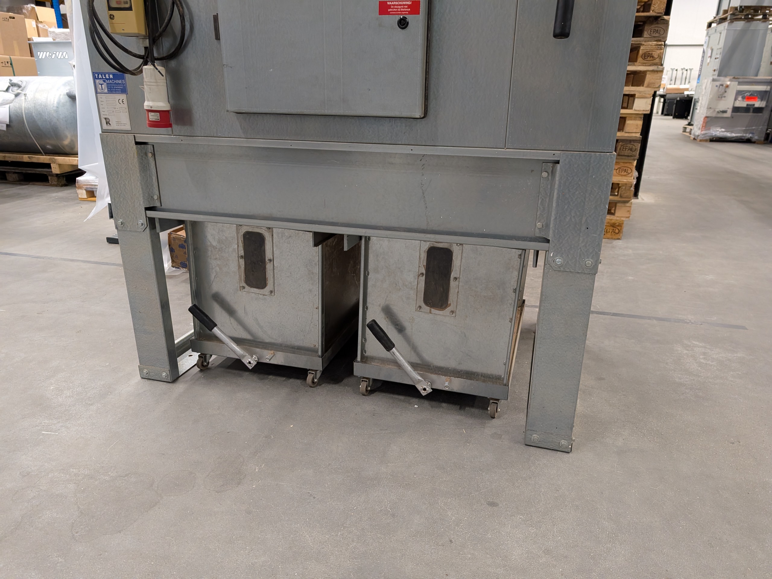 Gebruikte afzuigunit van het merk Riedex. Het stof word opgevangen in 2 verrijdbare bakken aan de onderkant van de machine.