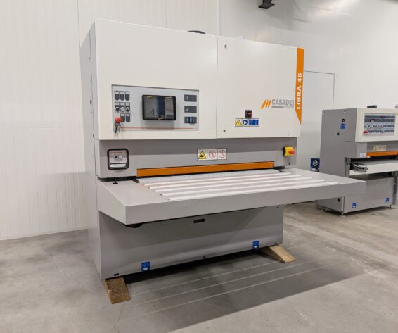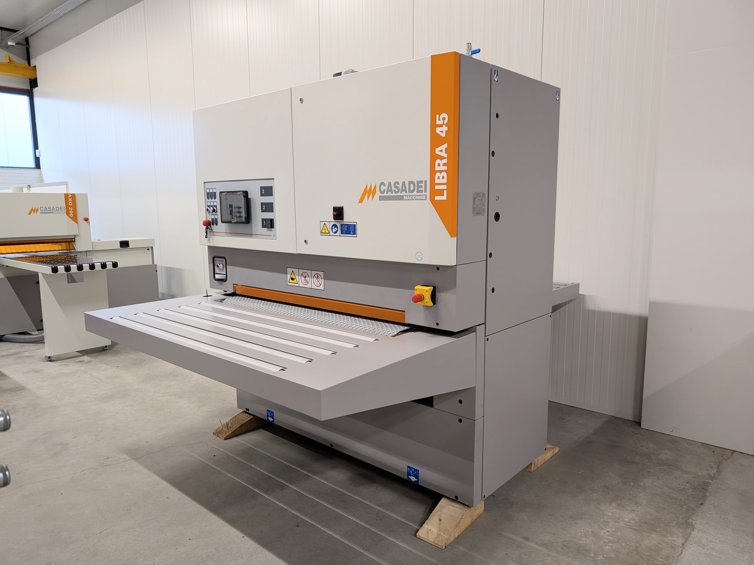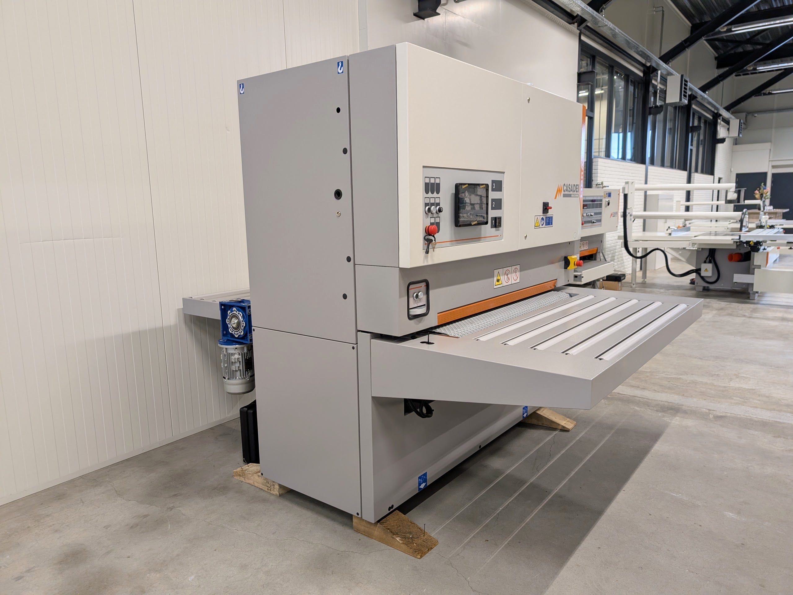 Breedbandschuurmachine met twee schuurunits en digitale hoogteuitlezing. De machine is voorzien van een 10'' touchscreen en heeft een maximale werkbreedte van 1350 mm en een maximale werkhoogte van 170 mm.