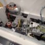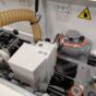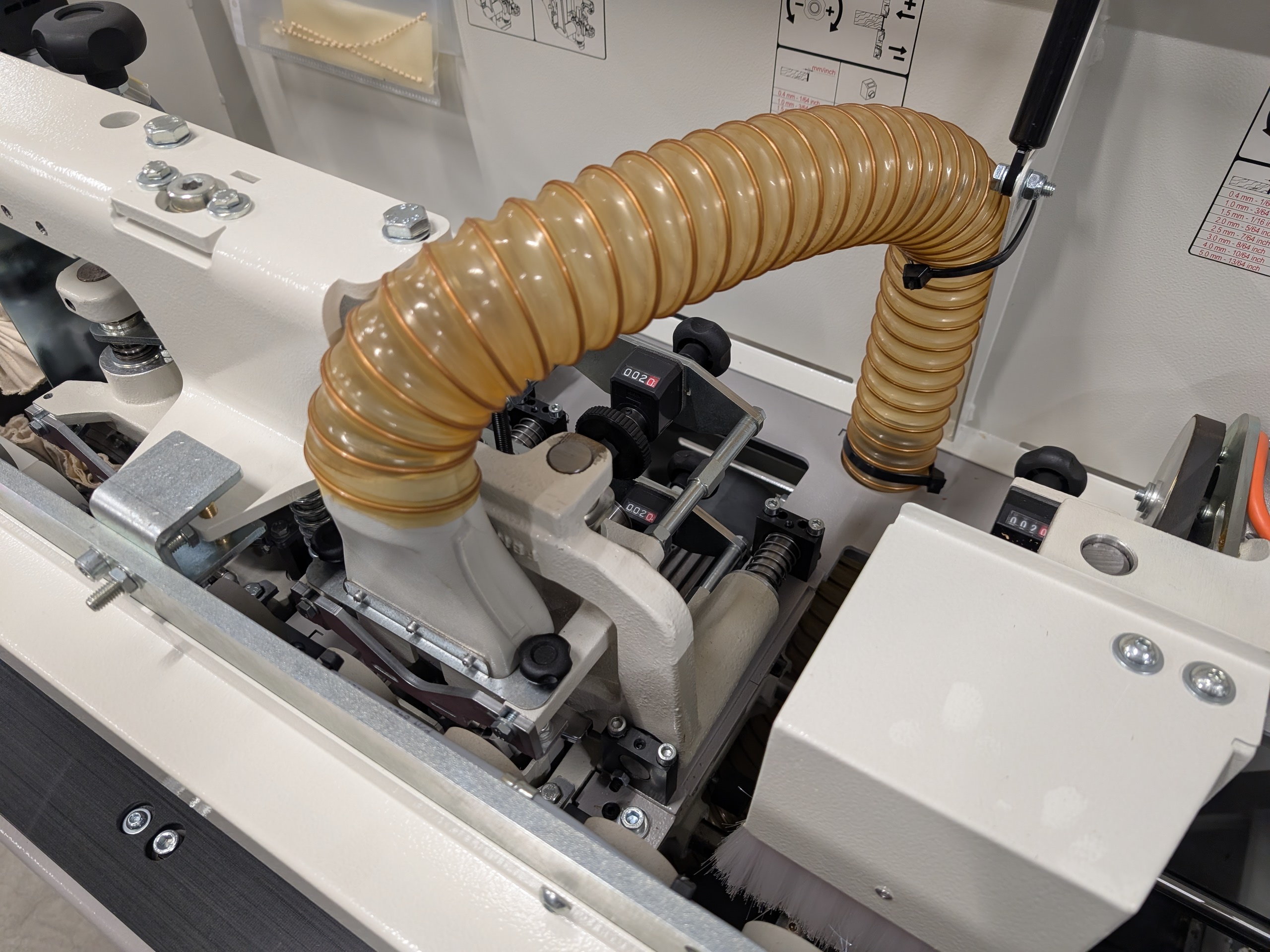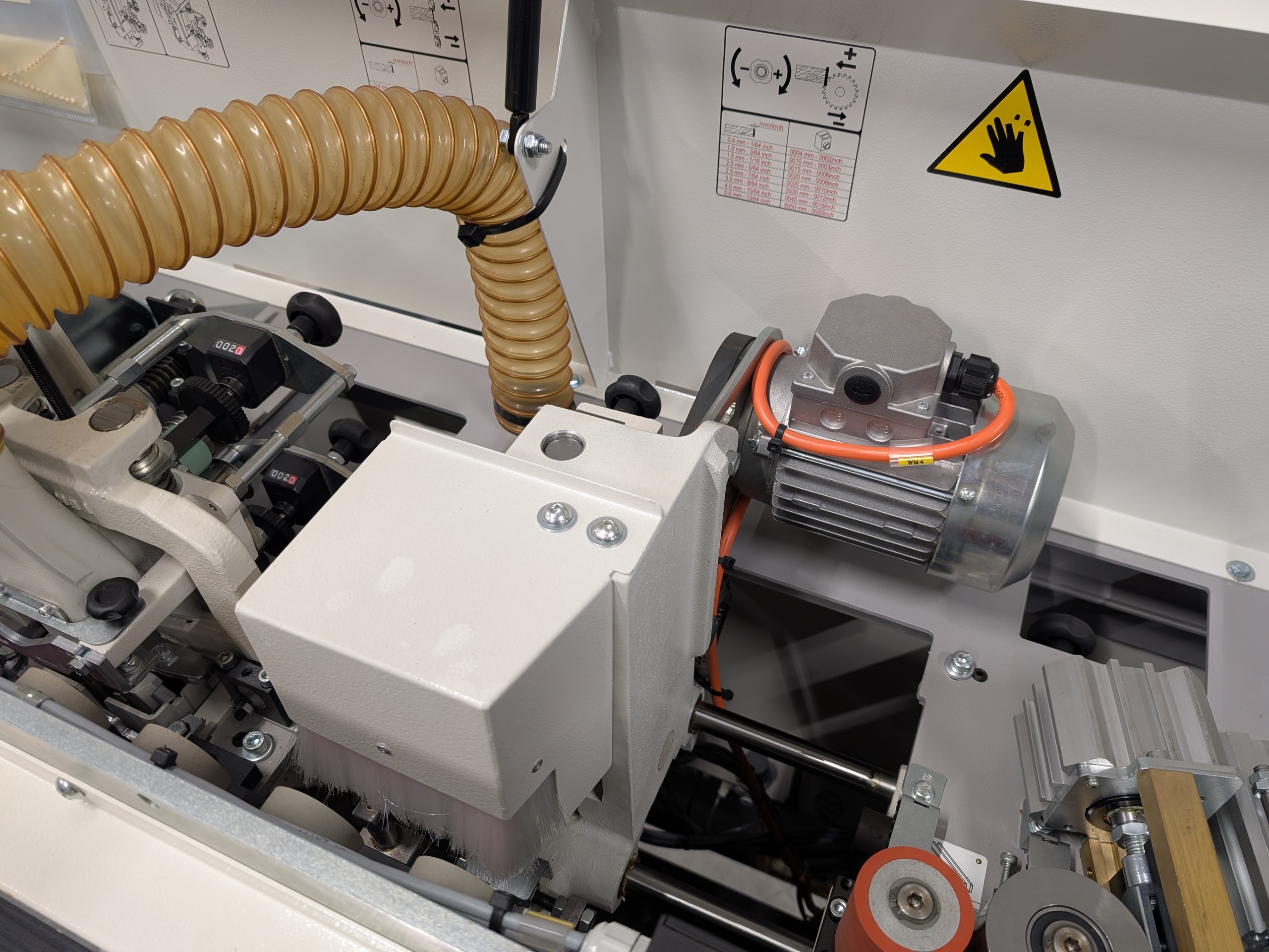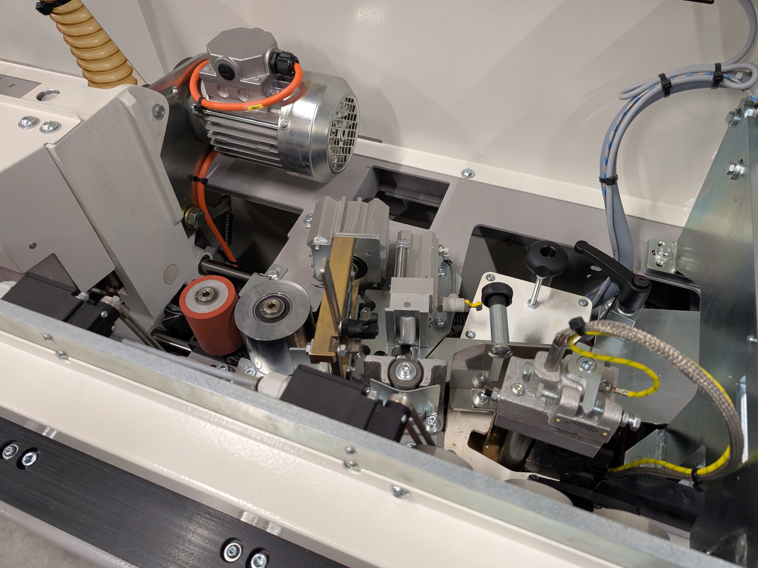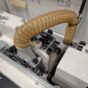 Compacte kantenaanlijmmachine met lijmunit, afkapzaag, radiusfrees, radiusschraap en borstelunit. Alle units zijn vanaf de voorzijde instelbaar.