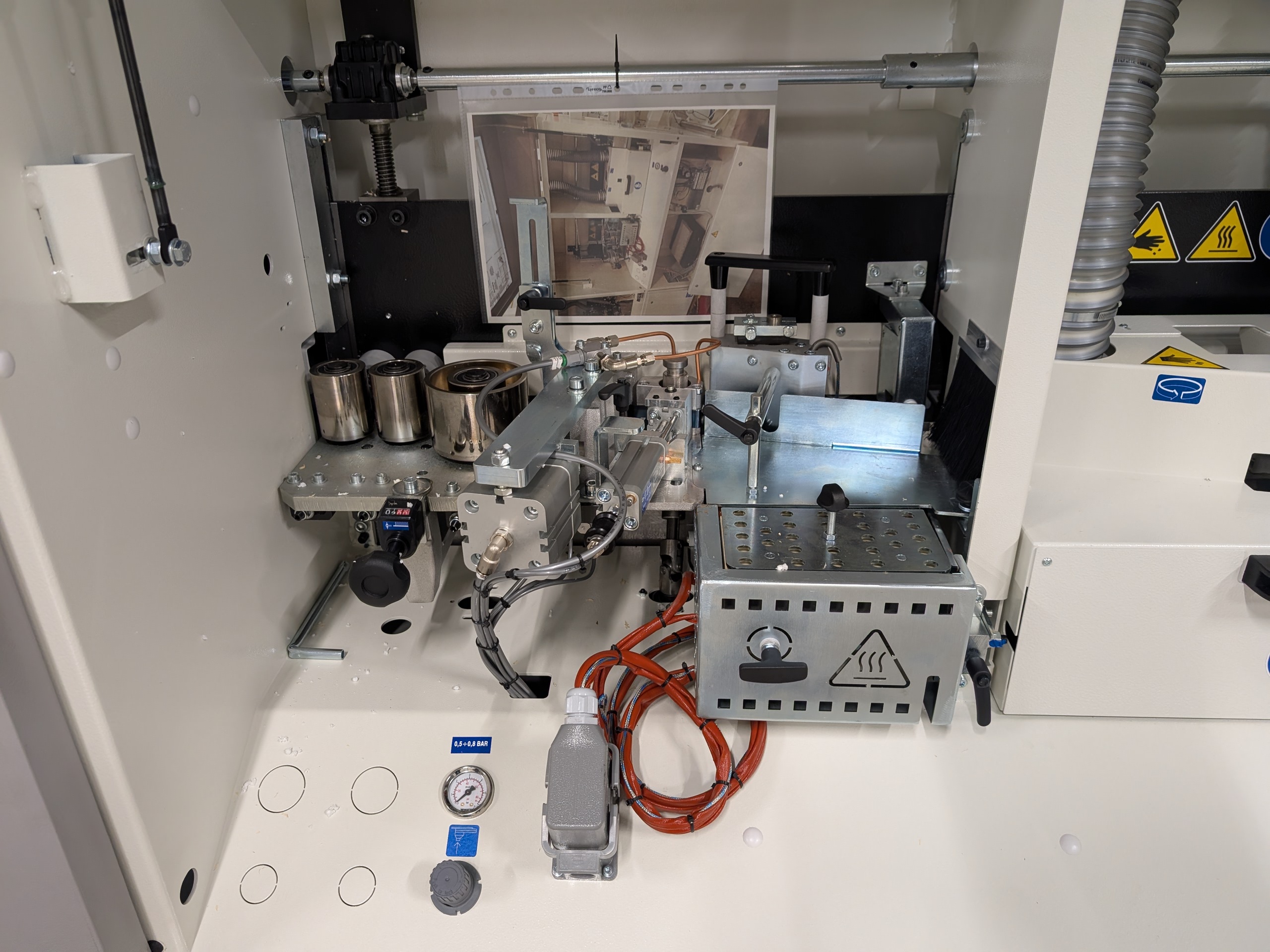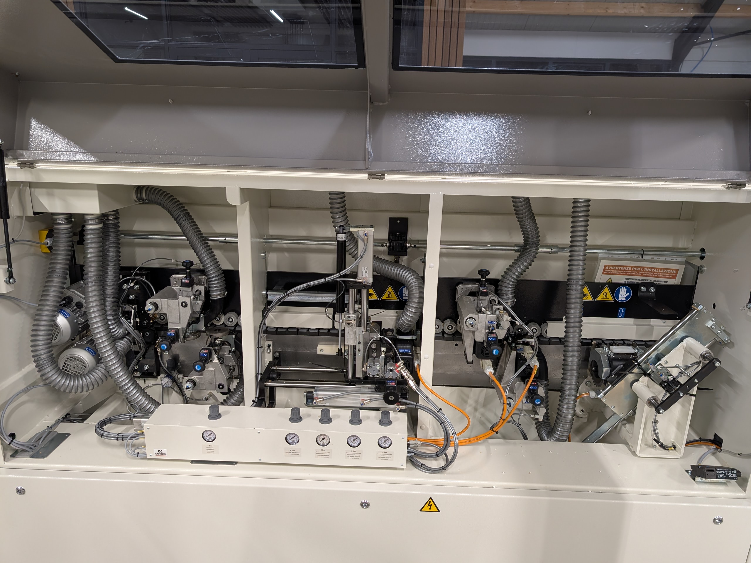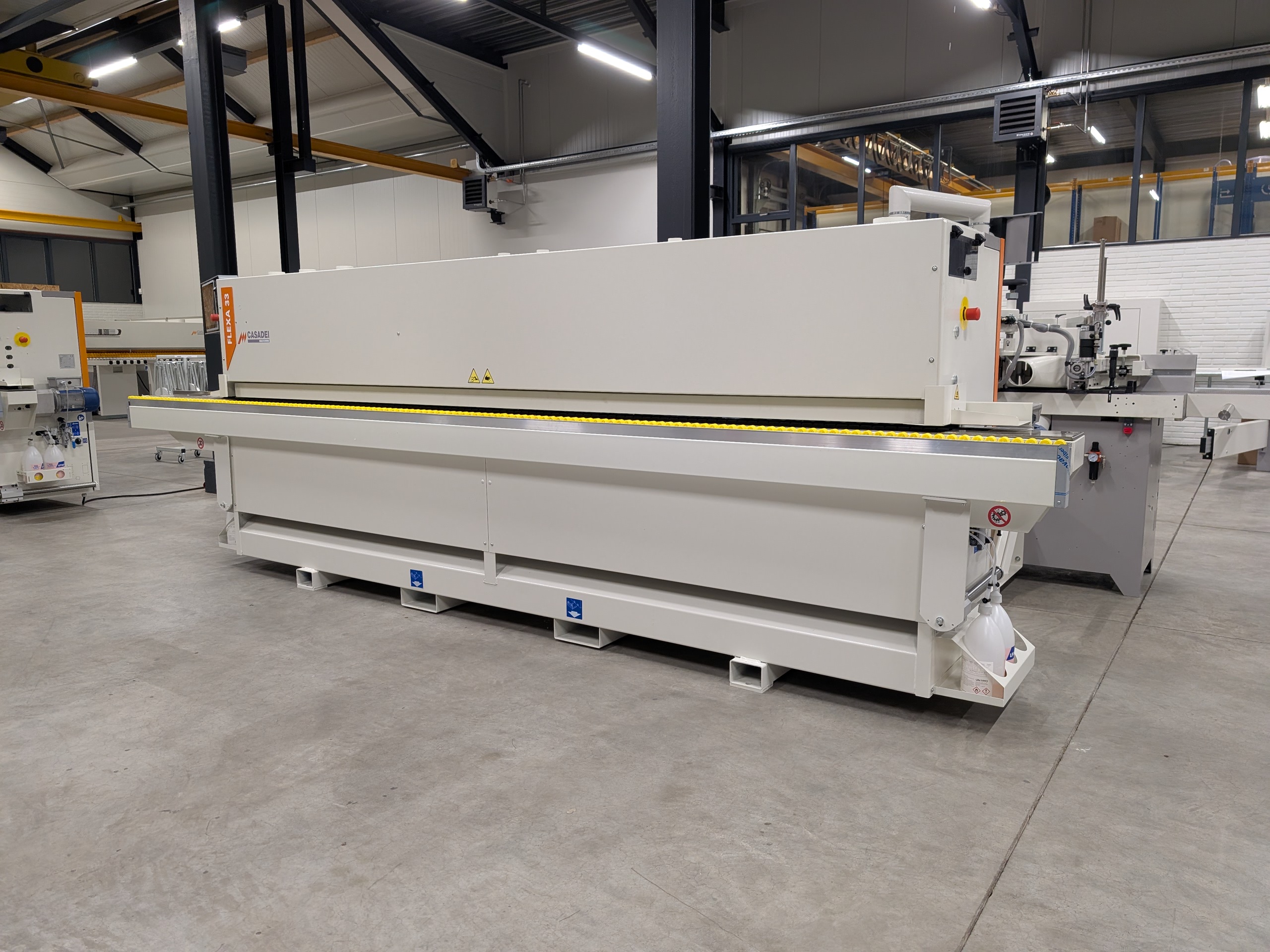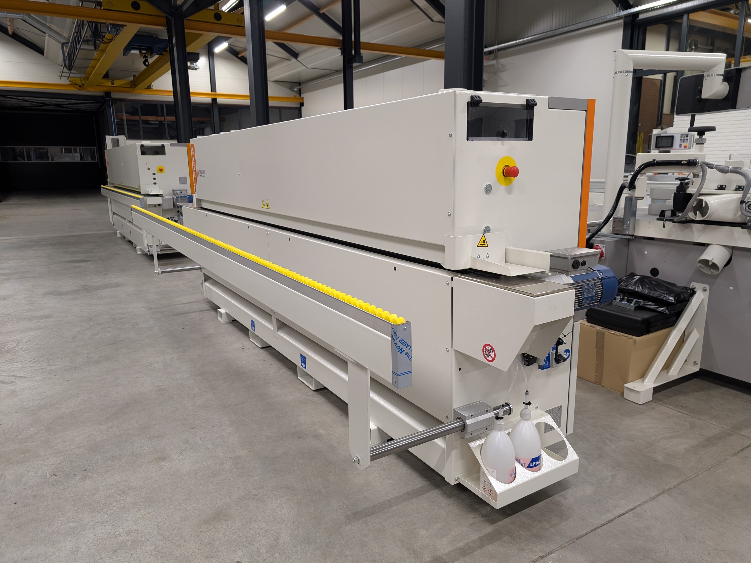 Kantenaanlijmmachine geschikt voor panelen tot 60 mm dikte en kantenband op rol tot 3 mm dikte. Het bedienen van de machine gaat via het 15'' inch touchscreen aan de voorzijde.