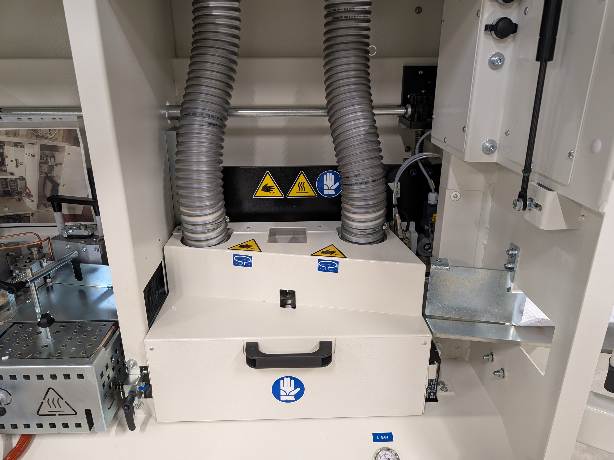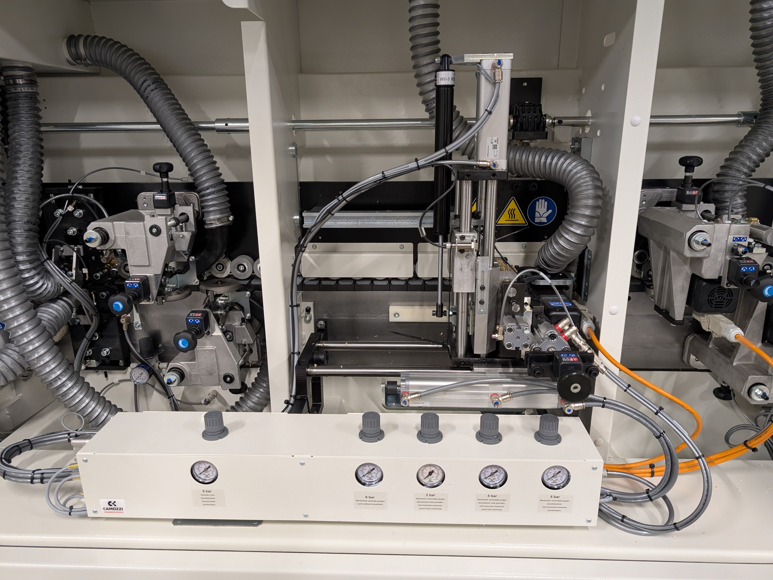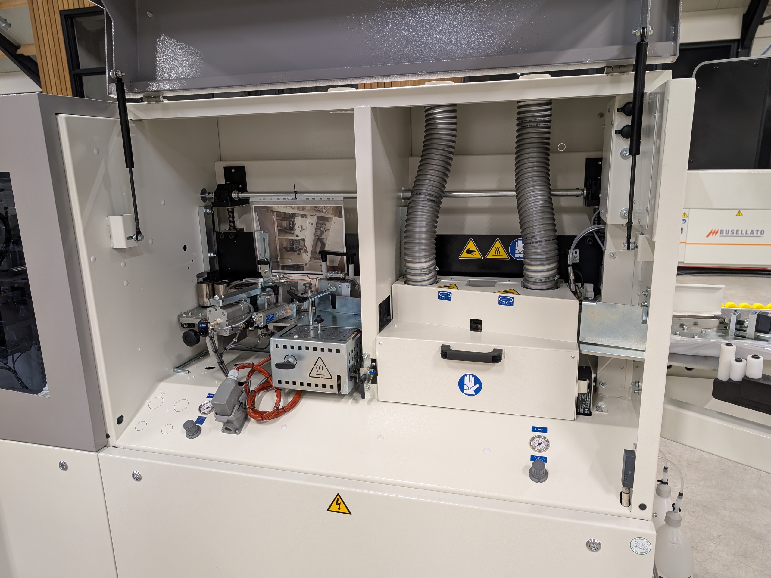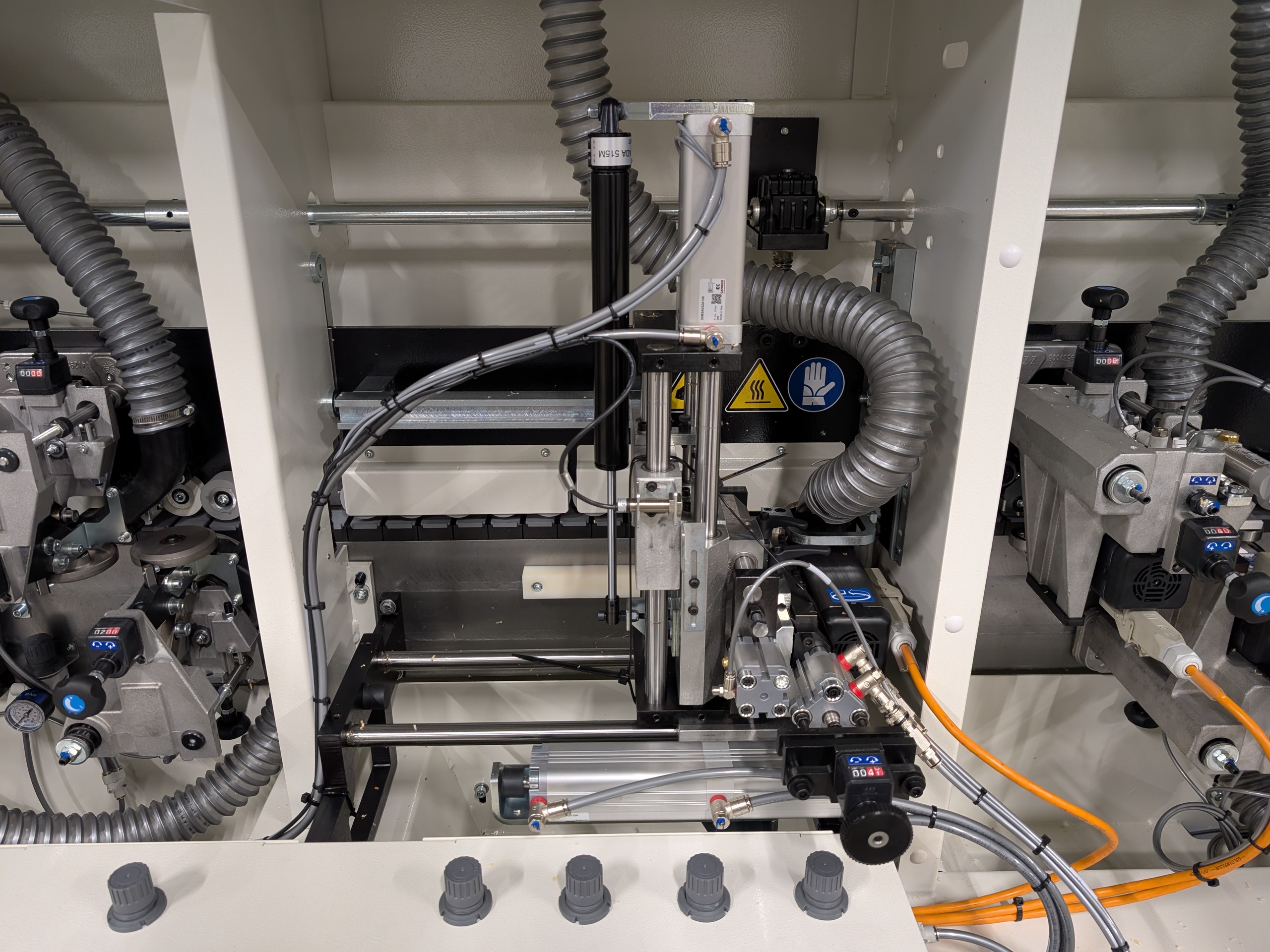 Kantenaanlijmmachine geschikt voor panelen tot 60 mm dikte en kantenband op rol tot 3 mm dikte. Het bedienen van de machine gaat via het 15'' inch touchscreen aan de voorzijde.